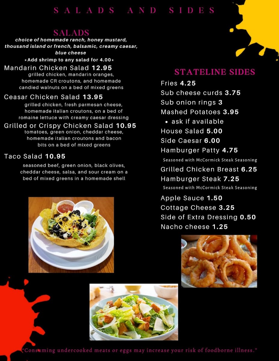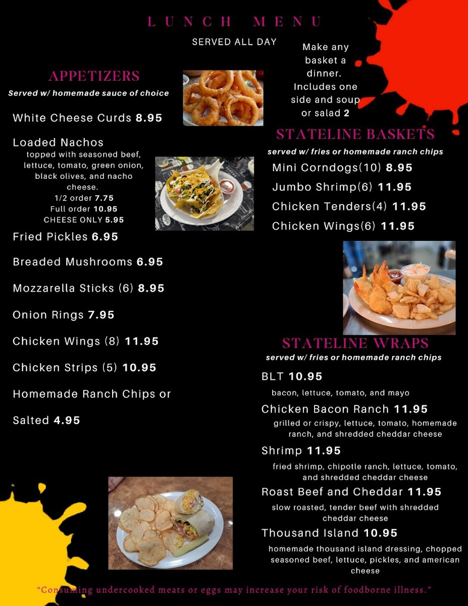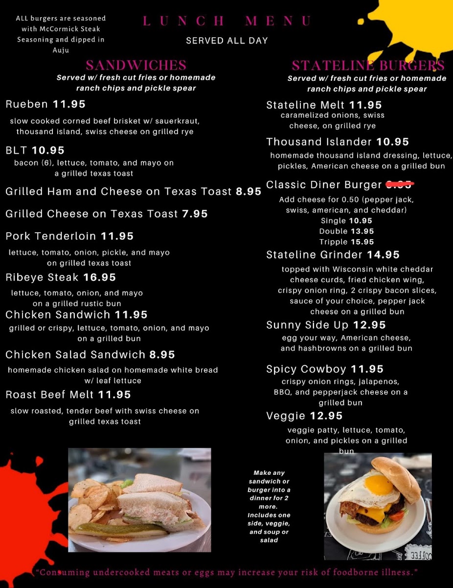 - Burgers: The Stateline Melt and the Spicy Cowboy burger bring robust flavors that are sure to satisfy any craving.